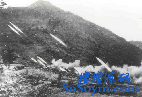 金城战役中,志愿军火箭炮向敌阵地射击